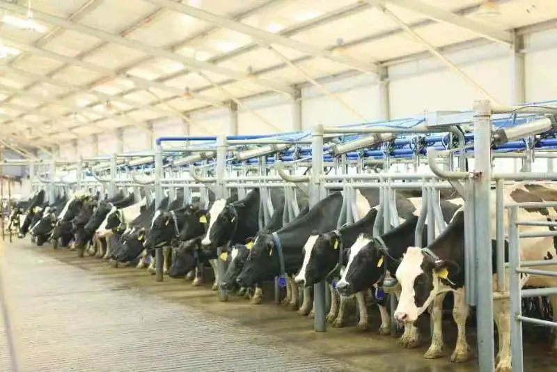 在飞鹤的勇进牧场挤奶间,每到“工作时间”,泌乳期的奶牛从自己牛舍的通道井然有序地走进挤奶厅,一个跟着一个上转盘,开始准备挤奶。