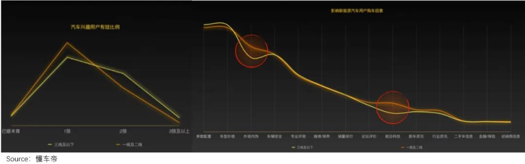 品牌认知度上,近6成下沉市场有娃群体购买新能源时,选择传统汽车品牌,选择新势力的人群只有16%。