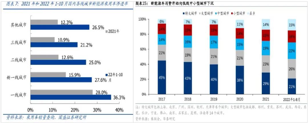 不过,2022年以来,下沉市场的新能源消费开始加速,不仅渗透率提升幅度快于高线城市,销量占比也提升明显。