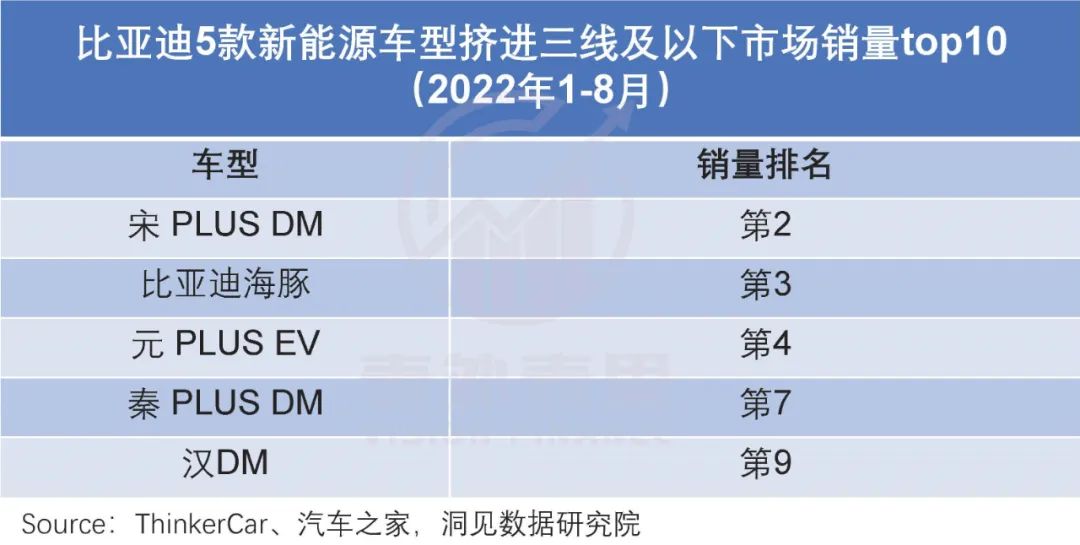 如下图,2021-2022年,比亚迪几款热销车型在三线及以下城市销量占比,从30%增长到近40%。