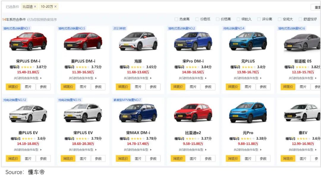 当然,或许有人会质疑,下沉市场对新能源汽车消费,聚焦在10万以下的微型电动车。而比亚迪的车型大多数集中在10-20万的价格带里(总计12款),似乎并不符合下沉市场的需求选择范围。