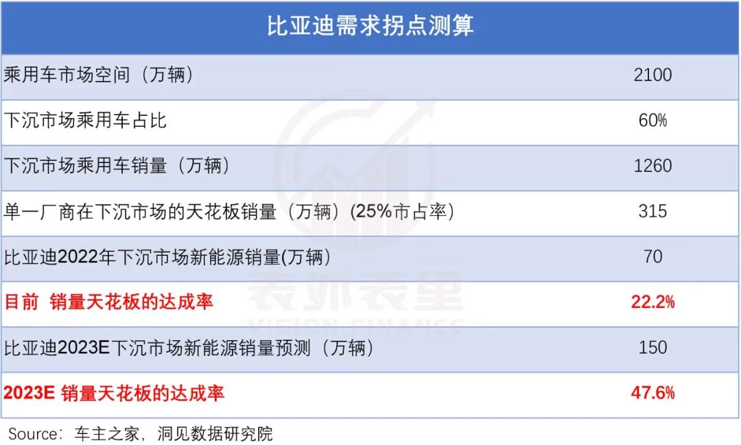 数据显示,截至2022年底,比亚迪下沉市场已实现销量70万辆,占到天花板销量的约22%。