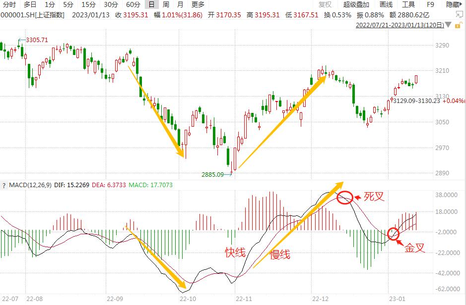 (1)当快线自下向上交叉慢线时为“金叉”,一般是买入信号,尤其是快线由0轴以下上穿过慢线时,买入信号更加强烈;