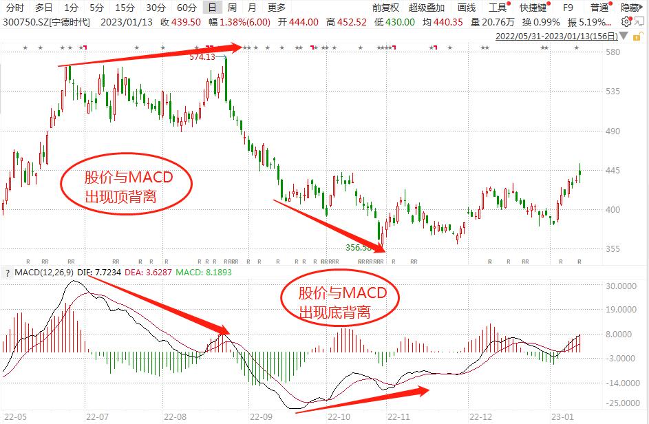 以宁德时代为例。在图中第一个圆圈区域处,公司股价虽然创下新高,但是明显可以看到MACD的红柱高度和面积是在减小的,这便是顶背离的出现,随后公司股价进入了漫长的下跌周期;而在图中第二个圆圈区域处,公司股价虽然创下了新低,但MACD的绿柱长度和面积亦是在减小,随后“跌跌不休”的趋势宣告结束,公司股价进入到震荡上行的新阶段。