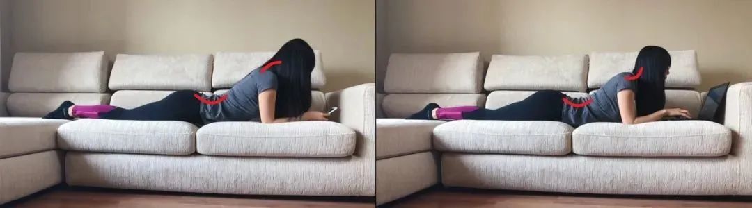 趴着用手机或电脑,需要用手肘撑起上半身。这时,肩关节角度与肩胛骨位置偏离自然状态,很快会出现肩及上背部不舒服。
