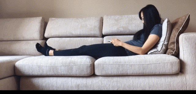 相对于直立坐着,半坐半躺时维持头部抬起的肌肉用力少,不容易疲劳[10]。但如果把手机放在腿上,一直低头看屏幕,反而容易头颈痛[11-13]。 这个姿势下,要把手机举起来看,才能保证头部与身体在一条直线上。