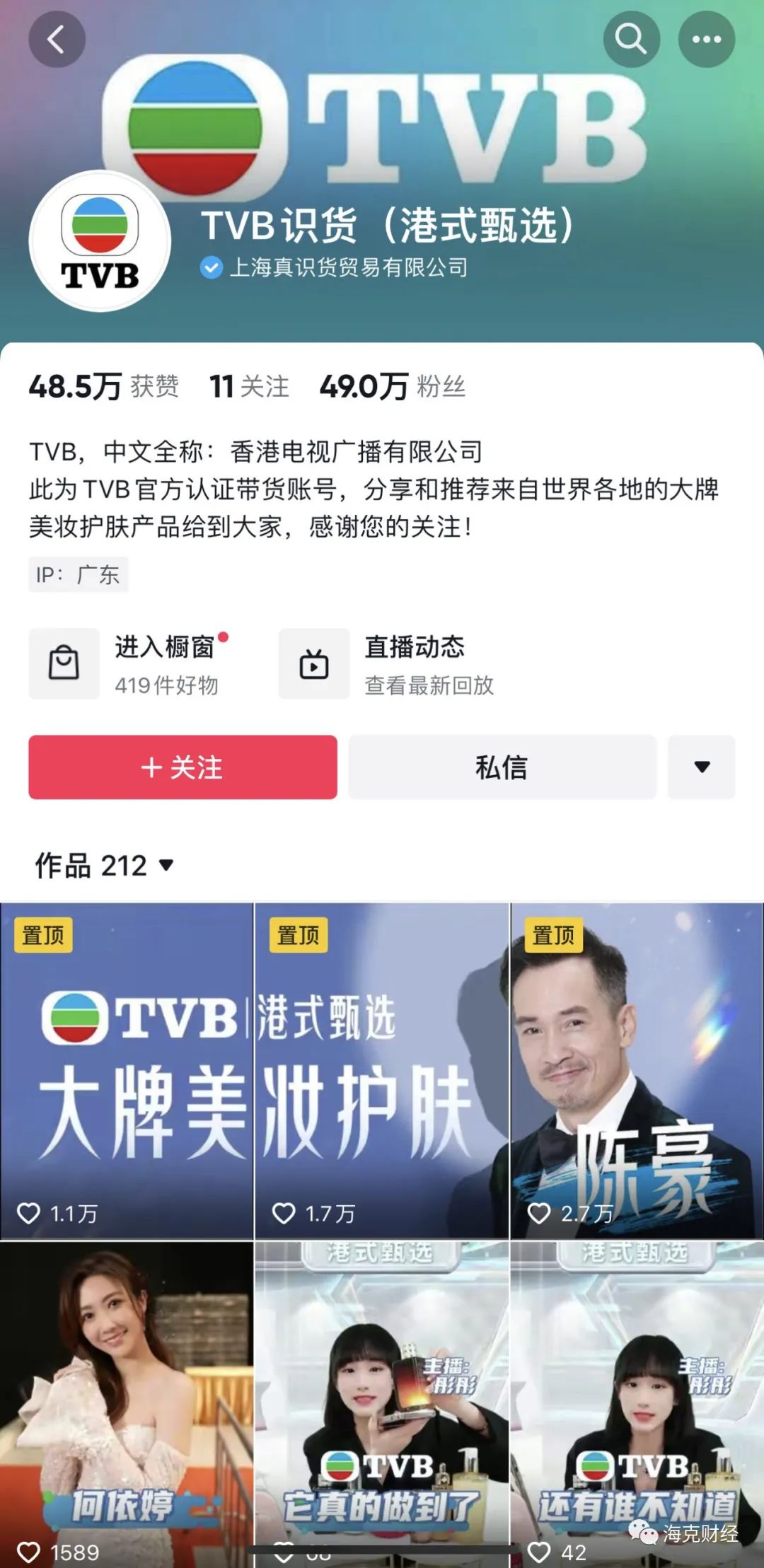 就财报所见,收购士多客观上将TVB 2021年全年电商收入推高到了5.93亿港元。同比增幅着实可观,但绝对数字依旧太小。2022年4月,TVB还在抖音开设了“TVB识货”系列账号,以期打造针对内地市场的带货渠道,但其中粉丝量最高的“TVB识货(港式甄选)”目前也仅有49.0万粉丝,尚达不到抖音腰部带货主播的级别。