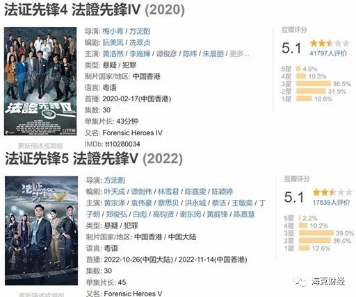 2006-2011年,TVB推出了《法证先锋》系列3部剧集,豆瓣评分分别为8.8、8.3、7.7分,是香港与大陆观众共同认可的经典。时隔近10年,TVB于2020年推出《法证先锋4》,首播收视率超过33点,但很快随着剧集播出而下滑。2022年再推出《法证先锋5》,观众亦不买账。两部续作豆瓣评分仅在5分左右。