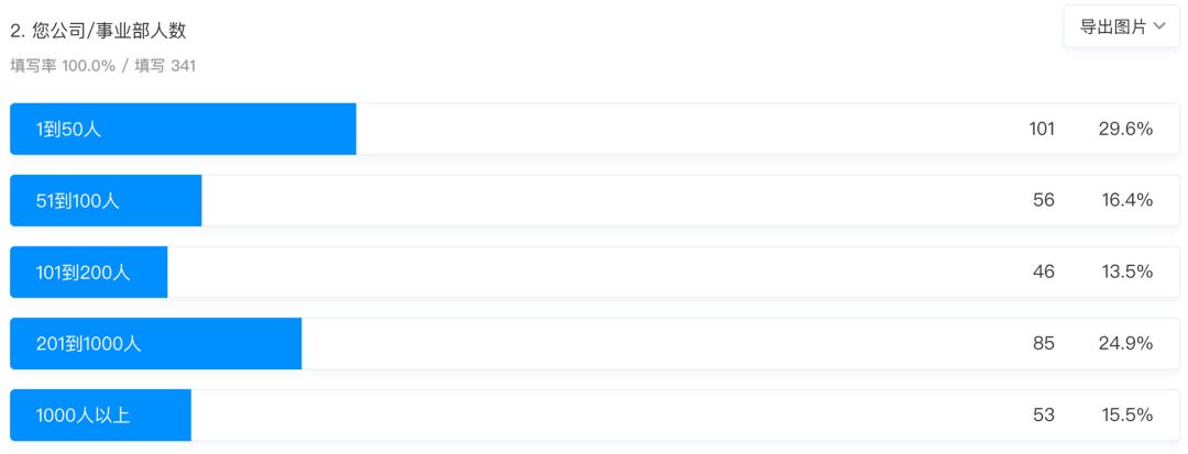 经过分析,我发现100人、1000人是两个重要的节点。1~100人规模的公司,100~1000人规模的公司和1000以上规模的公司,调研结果呈现出明显差异。