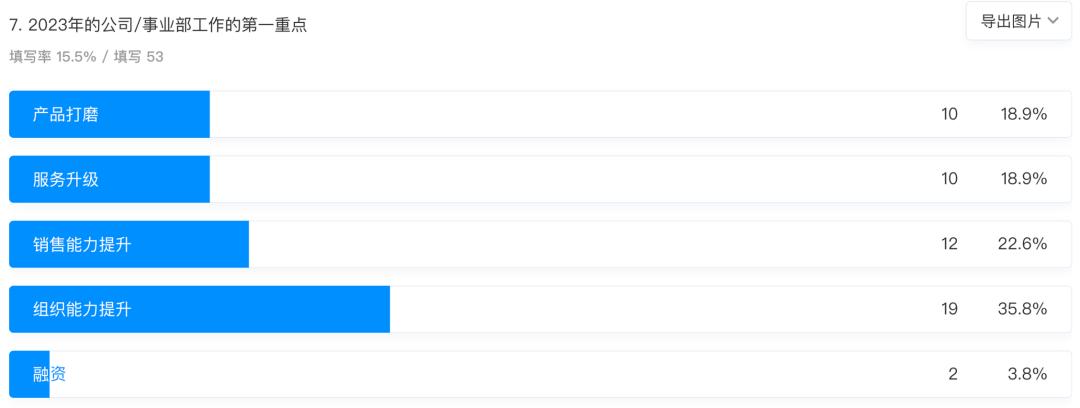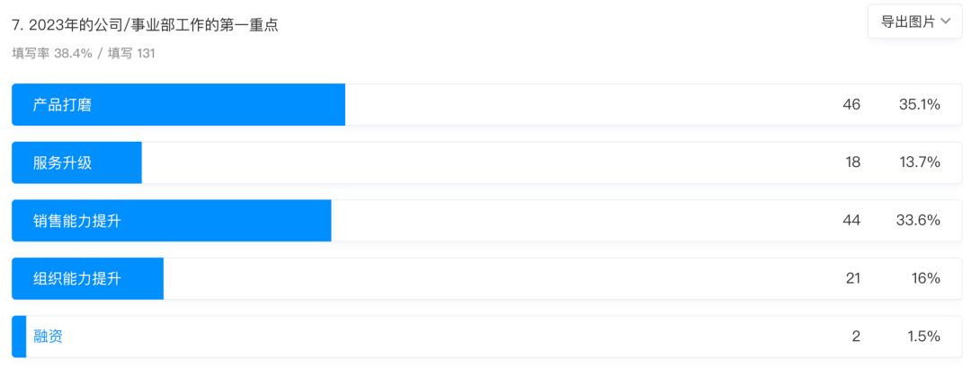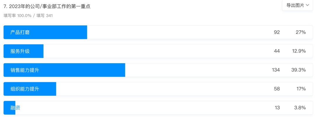 - 100~1000人的公司则更重视产品,有35%的公司把【产品】作为2023年最重要的事。当然,销售直接带来收入,所以有34%的公司更重视销售,也是能够理解的。