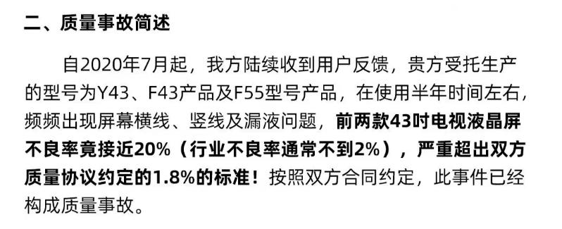 乐视此前有一批电视液晶屏,交给中电熊猫的工厂加工。结果,乐视发现代工的两款 43 吋液晶屏,居然不良率接近 20% 。