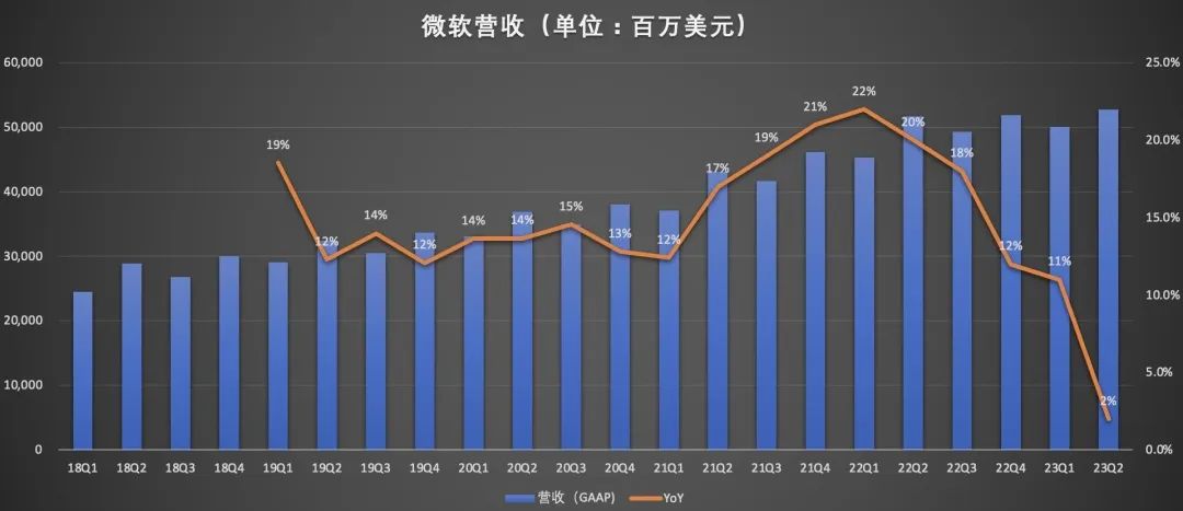 财报数据显示,微软2023年Q2实现527亿美元的总营收,同比仅增长2%,创近六个财年以来新低。