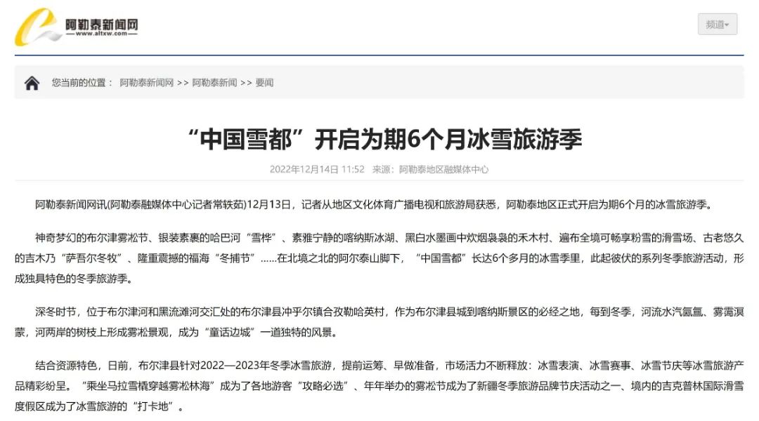 为了抢抓政策和市场机遇,新疆阿勒泰地区挖掘“全年雪期长达七个月”的天然优势,提出全新旅游品牌 “人类滑雪起源地、中国雪都阿勒泰”,扩建和新建了将军山滑雪场、可可托海滑雪场、禾木吉克普林滑雪场、青格里狼山滑雪场、野卡峡野雪公园等一批高标准的滑雪场和配套服务设施,2022年1月,新疆阿勒泰滑雪旅游度假地荣获首批国家级滑雪旅游度假地,国家体育产业示范基地等荣誉,2023年1月,阿勒泰地区富蕴县可可托海滑雪旅游度假地又成功入选第二批国家级滑雪旅游度假地。2022年12月旅游解禁后,阿勒泰地区吸引了来自全国各地的滑雪旅游爱好者和冰雪旅游消费者。