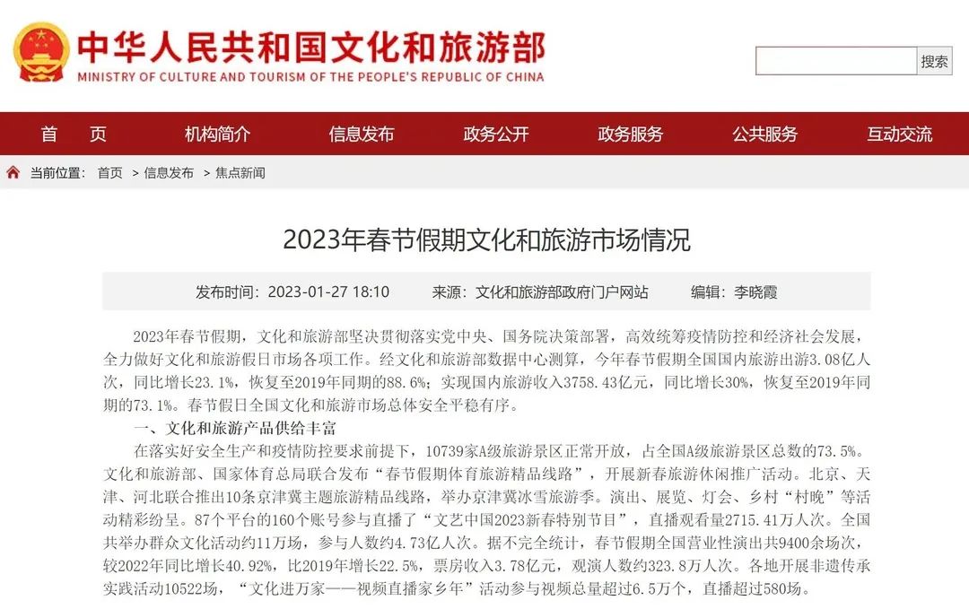 文旅部发布的2023春节期间数据暨出,文旅行业从业者一片拍手叫好。国内游人次超3亿人次,同比增长23.1%,而国内游旅游收入同比增长30%,恢复至2019年同期的73%。