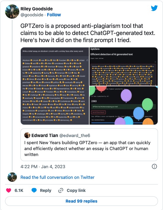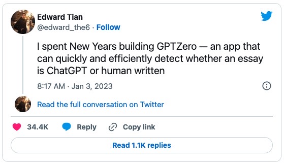 他最初的推文声称该应用程序可以“快速高效地”检测一篇文章是否由人工智能编写。后来,这条推文快速走红,阅读量超过了 500 万。