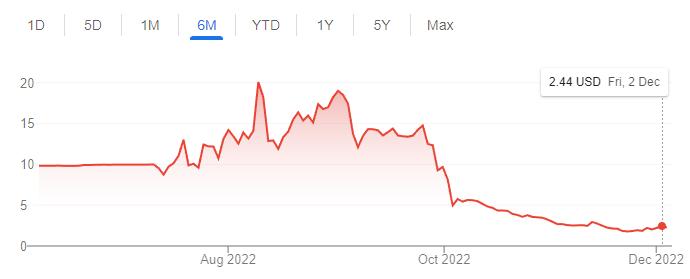 九月底开始,FaZe 的股价断崖式下跌,几天之内就从 15 美元左右跌到了 5 美元。