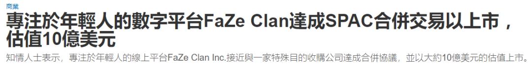TWSJ,專注於年輕人的數字平台FaZe Clan達成SPAC合併交易以上市 ,估值10億美元