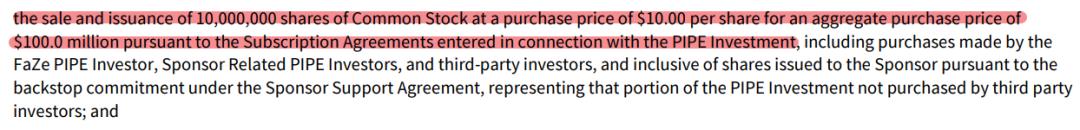 这是因为 9 月 26 日,FaZe 向美国证监会提交了一份表格,其中提到 FaZe 曾经与 PIPE 投资有一份担保协议,PIPE 会以 10 美元一股的价格收购 FaZe 1000 万股股票,总计 1 亿美元。