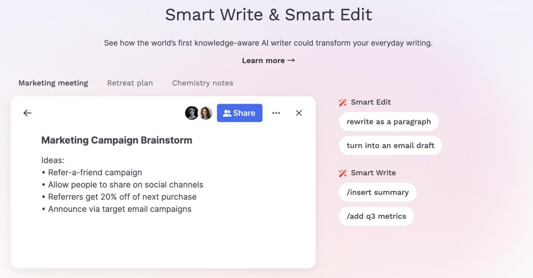 在最近的产品更新中,Mem 还完善了其内置的「Mem X」工作助手(X代表付费计划),新增了智能写作和编辑等新功能,根据文字描述让 AI 完成例如内容文本生成、总结文件、编写文案以及调整格式等需求。