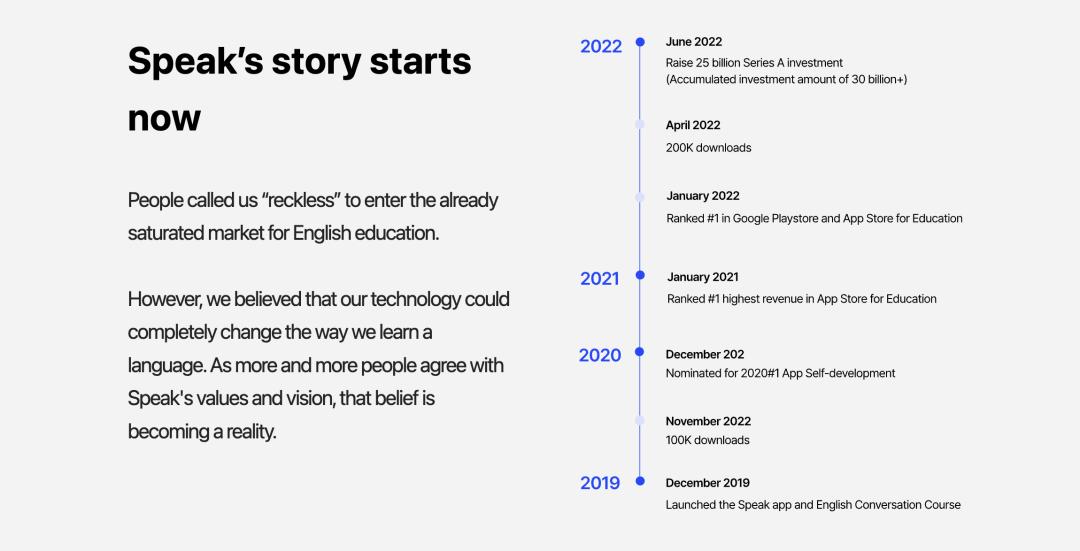 Speak 是一个通过 AI 帮助人们学习英语的平台,它为用户提供了与母语人士进行真实对话的体验。韩国是 Speak 第一个选择进入的市场,并在推出的 1 年内获得超过 100 万次下载,先后获得 App Stroe 和 Google Playstore 教育类目的第一名。