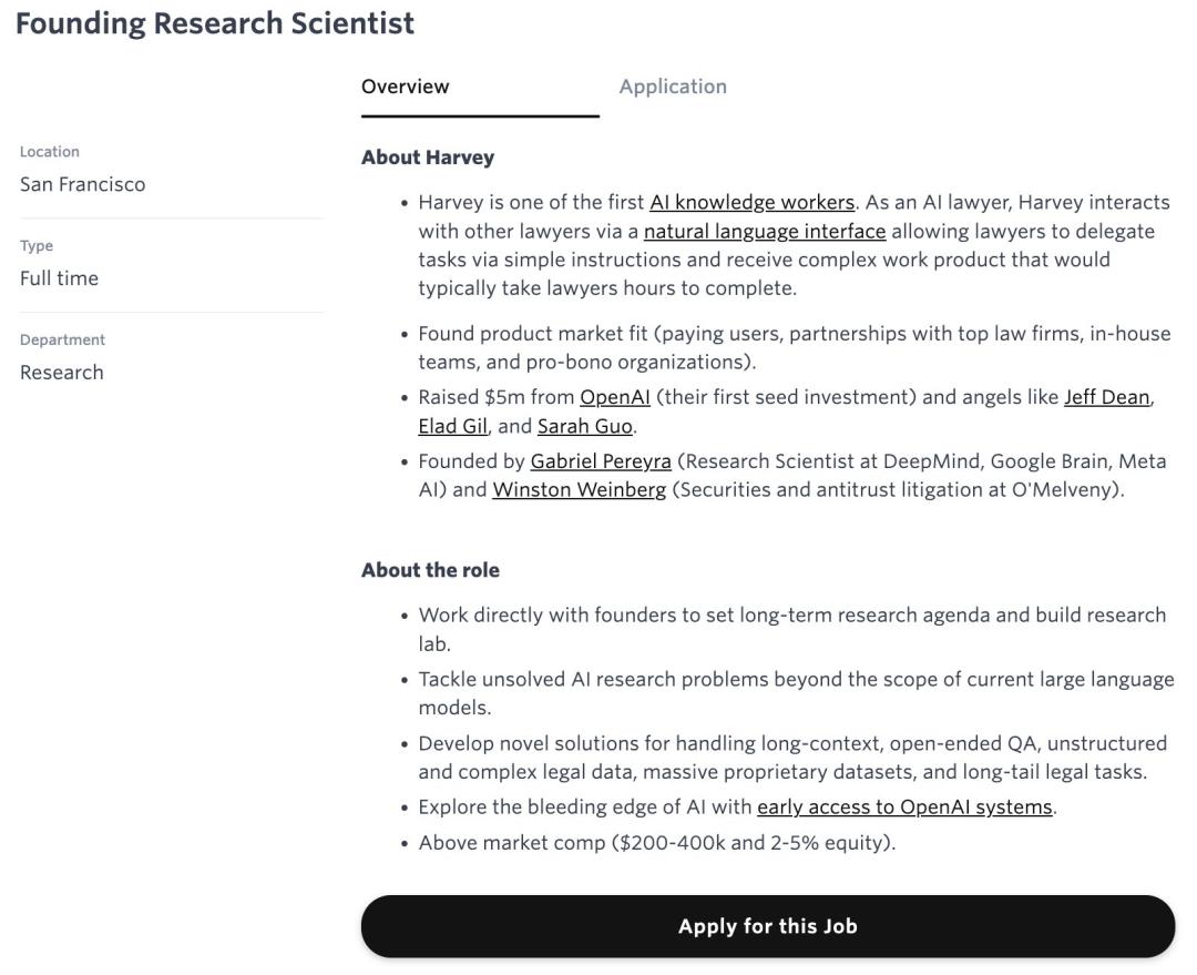 回到 Harvey AI ,两位创始人一位是律师,另一位是 AI 科学家,互为室友关系🧑🤝🧑。有一天科学家室友向律师室友介绍了 GPT-3,律师室友顿悟了他的 aha-moment,并意识到了 GPT-3 可以为律师工作流程提供一个基于自然语言的交互界面。