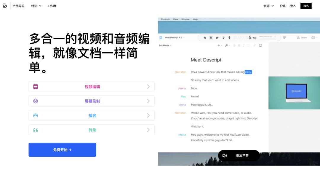 那么 Descript 是一款怎么样的产品呢?Descript 创立于 2013 年,是一种协作式音频和视频的 SaaS 编辑工具,支持将音频转录为文本文档进行编辑,它还为语音音频文件提供自动和手动转录解决方案;此外,该平台利用语音识别技术在短时间内转录音频和视频文件。