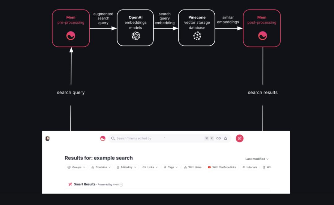 深挖 Mem 产品的背后,其借助了 OpenAI 的嵌入模型以及 Pinecone 的矢量搜索来作为 MemX 的底层能力,例如用户在 Mem 中进行搜索,通过对话一般的自然语言叙述,Mem 能够理解用户输入的语义并找到最相关的结果,未来 Mem 还希望能够自动梳理一个团队/组织内的所有信息,包括从员工信息再到客户数据、内部文件、研究、邮件、Slack 信息以及更多,可谓是野心不小。