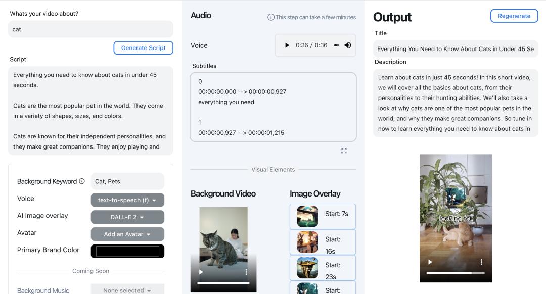 基于给出的提示,QucikVid 先利用 GPT-3 的生成文本功能生成短视频脚本,再从脚本中自动提取或手动输入的关键字,基于这些关键字从免费的 Pexels 库中选择背景视频,同时叠加由 DALL-E 2 生成的图像,并调用 Google Cloud 的文本转语音 API 来添加来自 YouTube 免版税音乐库的合成画外音和背景音乐。