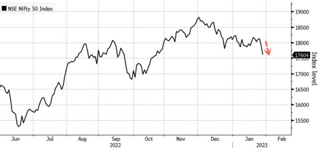 印度全国股市也被殃及,Adani Enterprises作为成份股的印度NSE Nifty 50指数跌至2022年10月以来低谷。