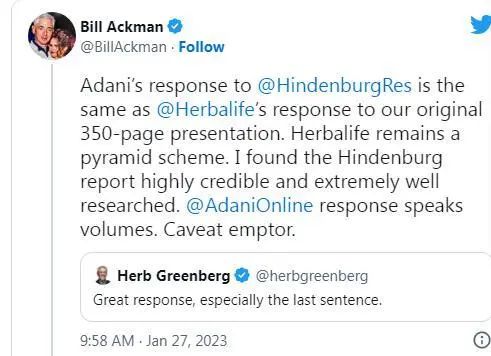 Adani对Hinderburg的回应和康宝莱对我们最初350页的报告回应一样。康宝莱仍然是一个金字塔骗局。我发现,Hinderburg的报告可信度高,而且研究得非常透彻。Adani的回应很重要。买(Adani)的要自己负责。