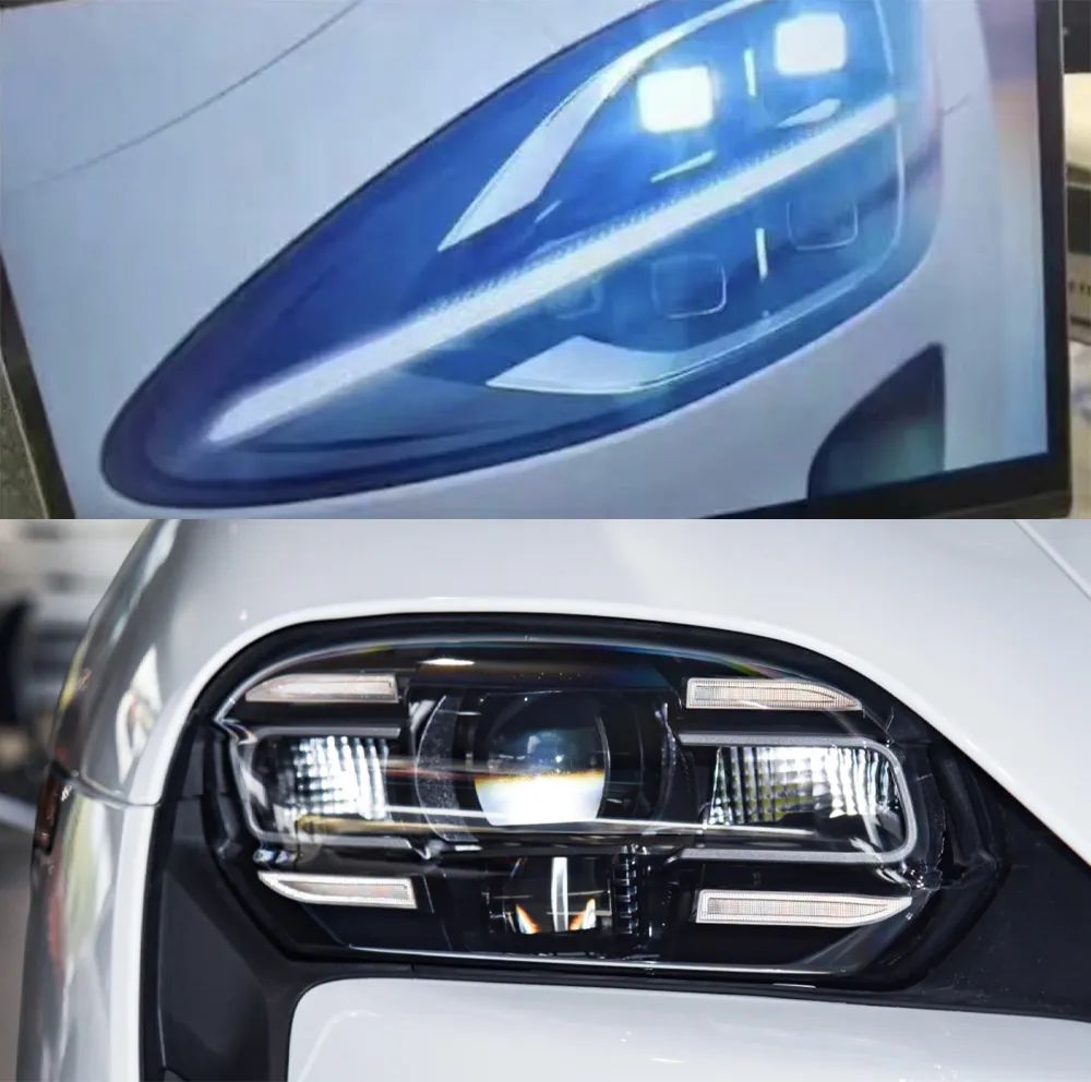 而大灯部分,该车的大灯内部有四个小的灯组,这四个灯组或许可以根据需要而转变方向位置,这和保时捷Taycan的四眼大灯看上去也有一点类似。