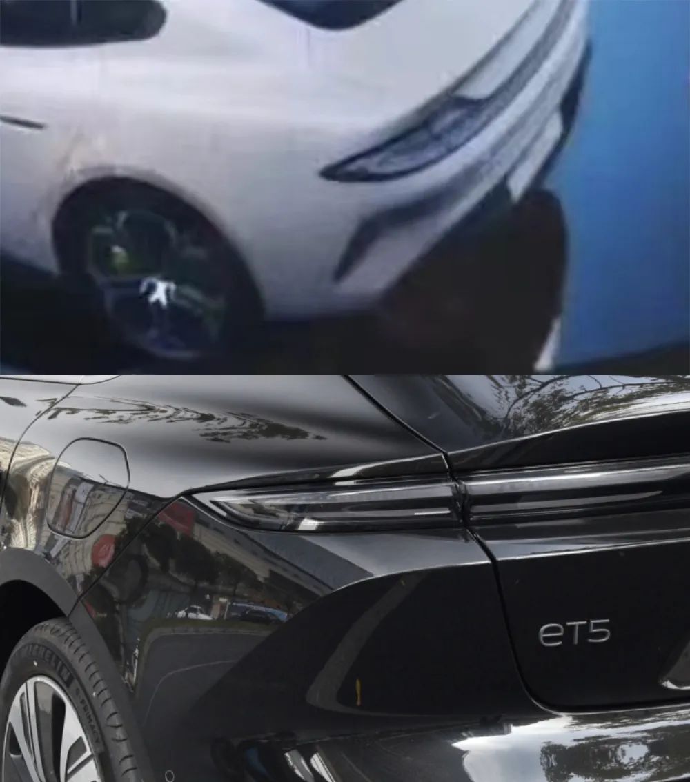 而车辆尾部可以看到的东西并不算多,仅可依稀看到一个似乎熏黑的尾灯,尾灯的造型非常犀利,但如果细看的话,不难发现和蔚来ET5的尾灯造型 比较接近。