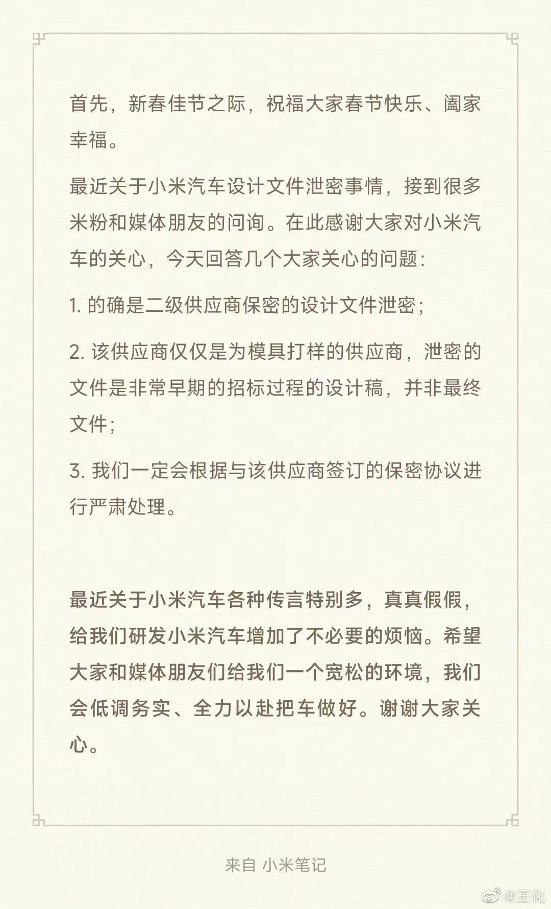 针对这组图片的曝光,小米集团公关部总经理王化在微博做出了回应,他表示这的确是二级供应商保密的设计文件泄密,但该供应商仅仅是为模具打样的供应商,泄密的文件是非常早期的招标过程的设计稿,并非最终文件,此外他还表示将会根据与供应商签订的保密协议进行严肃处理,也希望公众给予小米汽车宽松的环境,让其“低调务实,把车做好”。