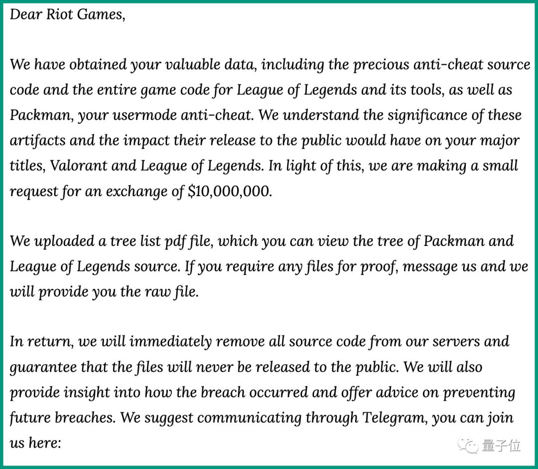 拳头也承认收到了一封勒索邮件,虽然官方没有公布这封邮件,但外媒Motherboard对信件内容做了爆料: