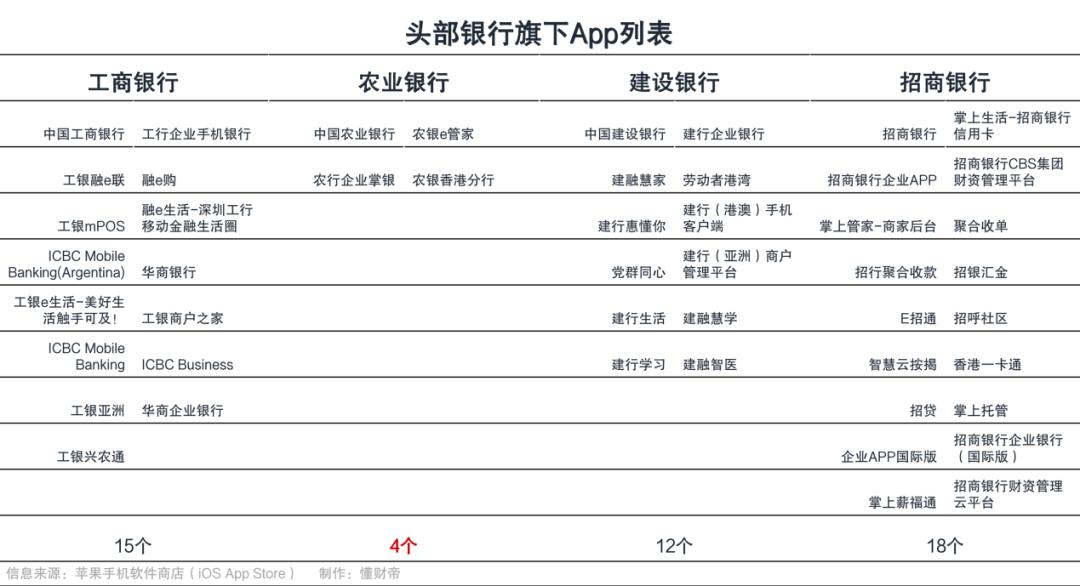转向微观视角,见微知著。懂财帝选取工行、建行、农行三家国有大行和股份行龙头招行作为分析样本,来观察旗下App的综合实力。