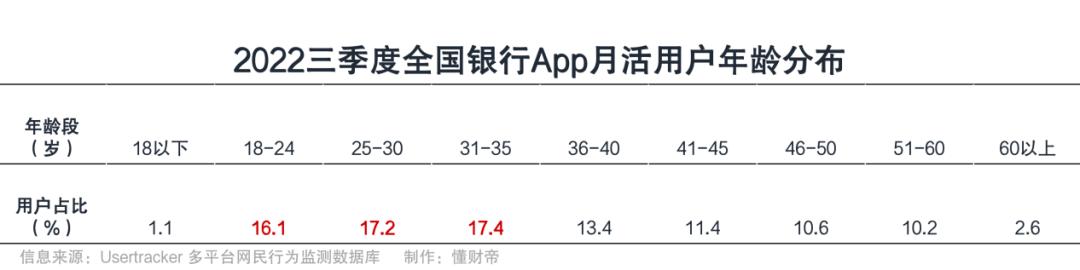 第三方机构统计数据显示,2022年三季度,银行App中,31-35岁用户最为活跃,25-30岁用户、18-24岁用户紧随其后,三个年龄段用户的占比合计已超过50%。
