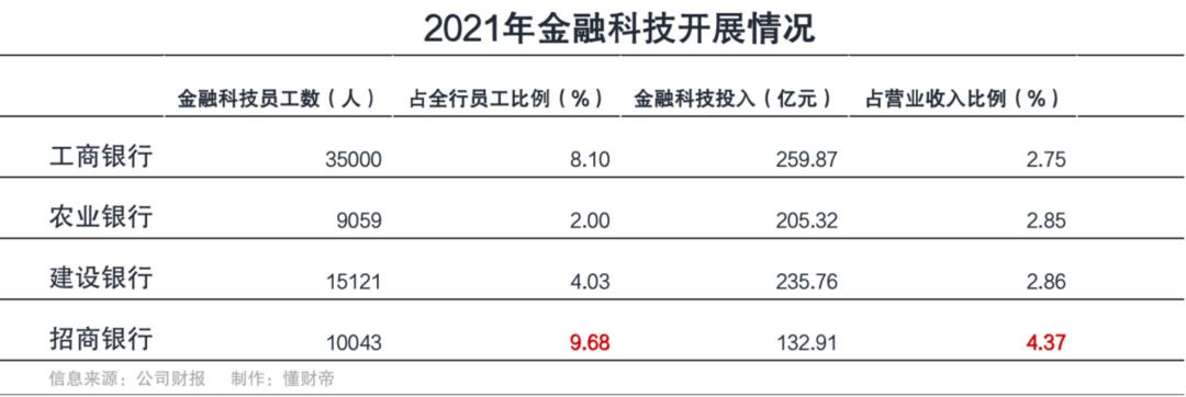 招行科技员工占比和金融科技投入占比最高,分别为9.68%、4.37%。并且比例还在提升,2022年上半年,招行科研人员占比上升至10%。