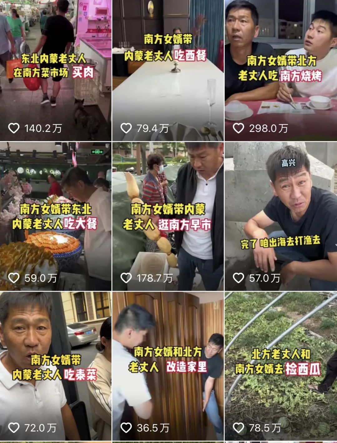 该账号主要记录了东北内蒙老丈人和上海女婿之间令人啼笑皆非的家庭趣事。视频中,我们能看到老丈人和女婿互相带领对方去各自的家乡感受当地的风土人情、饮食差异,由此碰撞出一系列意想不到的笑料。