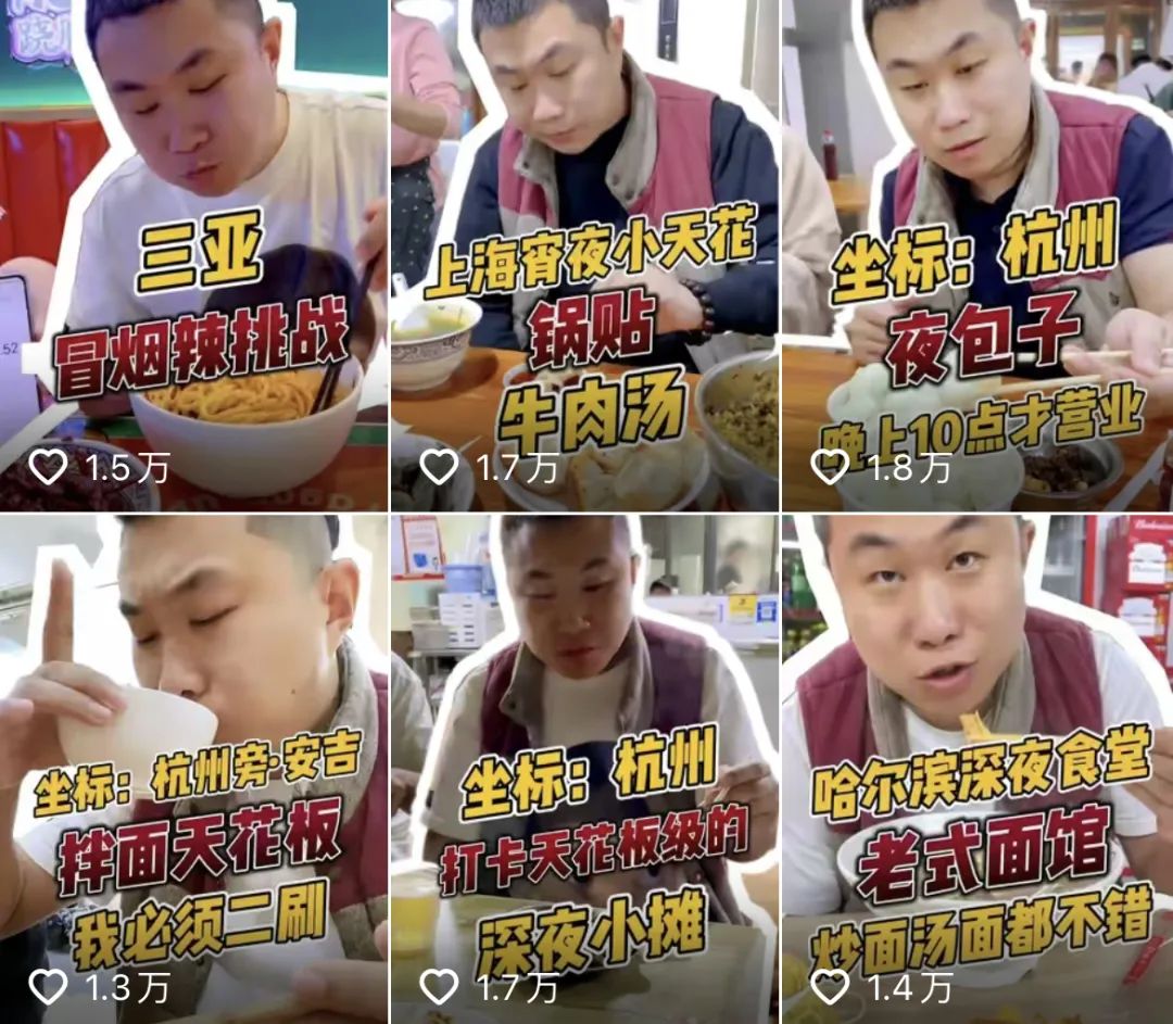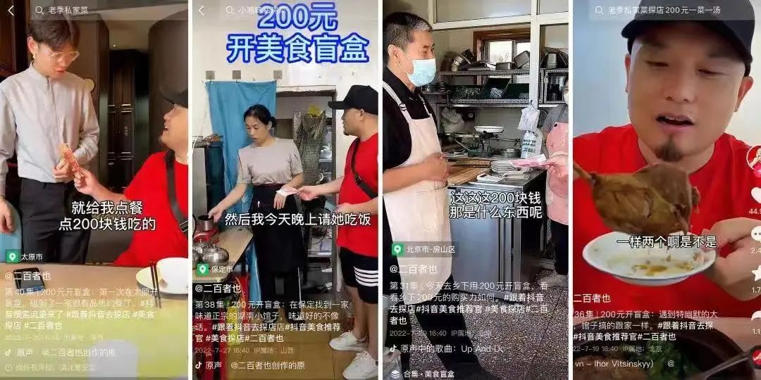 @哈尔滨好吃又好玩(风风)摆摊版的摆摊式美食呈现和东北爱情故事的结合,成功让账号在30天后粉丝翻倍。在此之前,探店达人@二百者也,在常规的探店测评内容之外,开创了“定额探店”玩法,即拿着200元四处开盲盒,“店家上啥我吃啥”,这种具备强趣味性和强吸引力的开盲盒式探店玩法无疑为用户带来了更多期待,@二百者也借此提高了自己的辨识度和记忆度,得以在一众同类型账号中脱颖而出。