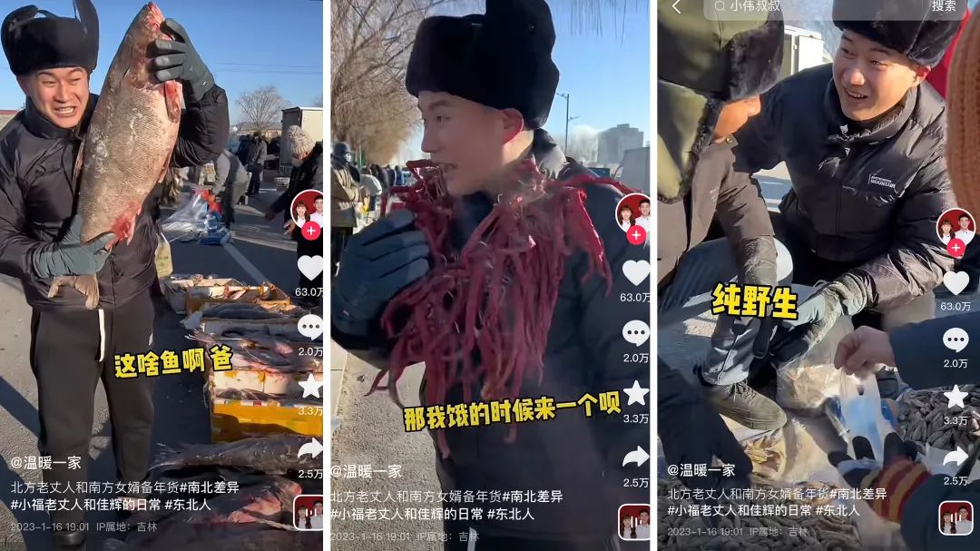 比如在最近发布的作品中,北方老丈人带着南方女婿去备年货,热闹的东北集市上摆满了各式各样的年货,十六七斤的大鱼、像瀑布一样倾斜而下的瓜子、以大袋形式出售的苹果、能当围脖的大串红辣椒、和人齐高的炮仗……一系列让人眼花缭乱的东北特色年货一次又一次震惊着南方女婿,让他不断发出连连惊叹。