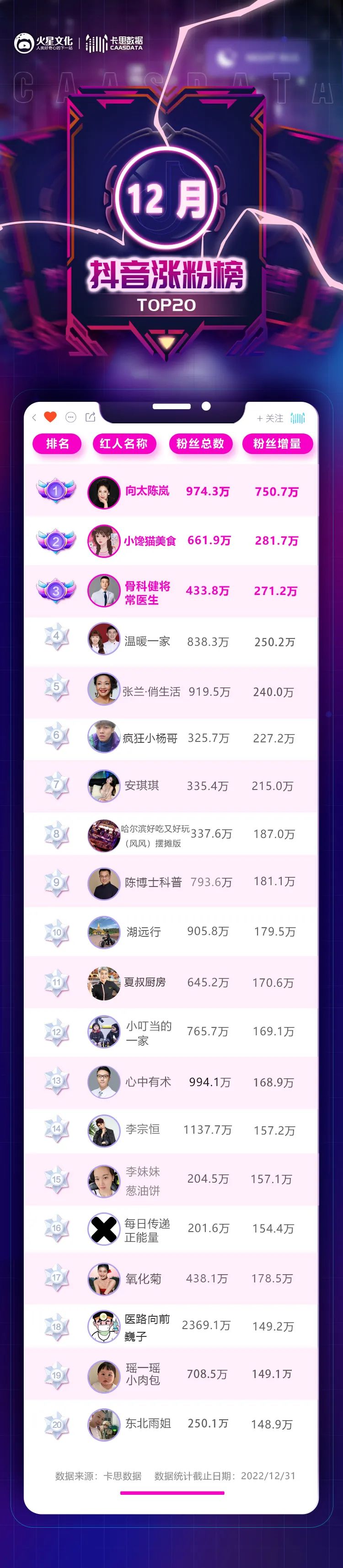 春节已过,2023年的大幕彻底拉开。在此之际,我们先一起回顾下2022年年末:看看2022年抖音内容生态如何收尾、有哪些达人乘上了涨粉末班车: