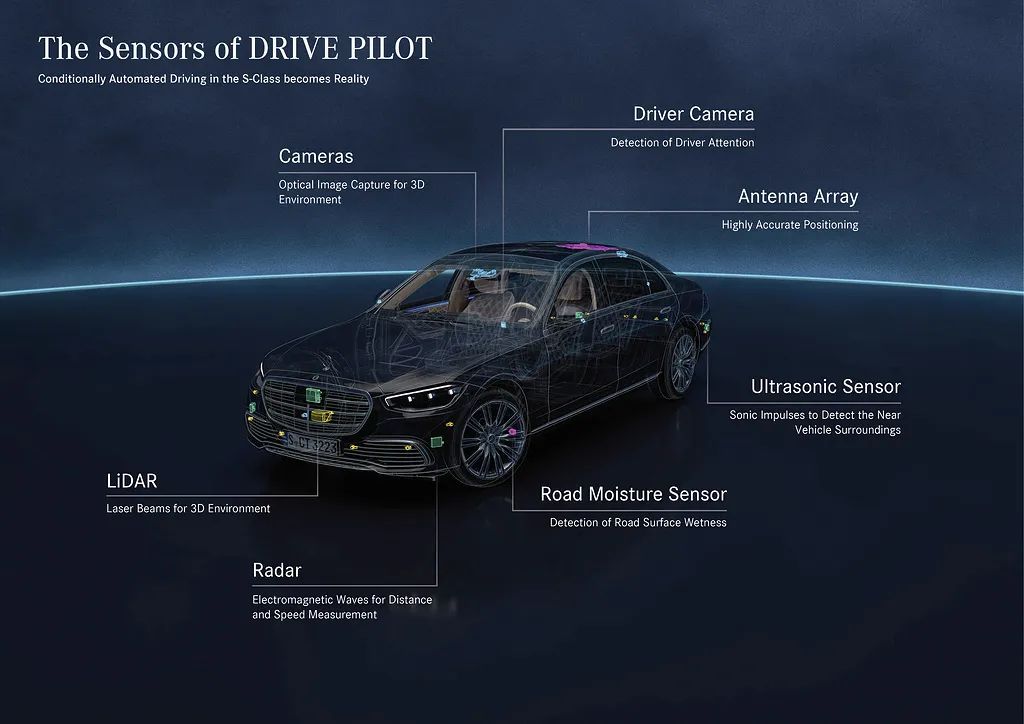 在硬件配置方面,DRIVE PILOT系统采用了诸多先进的传感器,包括超声波雷达、毫米波雷达、激光雷达、摄像头、高精定位单元和道路湿度传感器。此外,还配有冗余的转向和制动执行系统以及车载电气系统,即使这些系统中的一个出现故障,也能保持可操控性。
