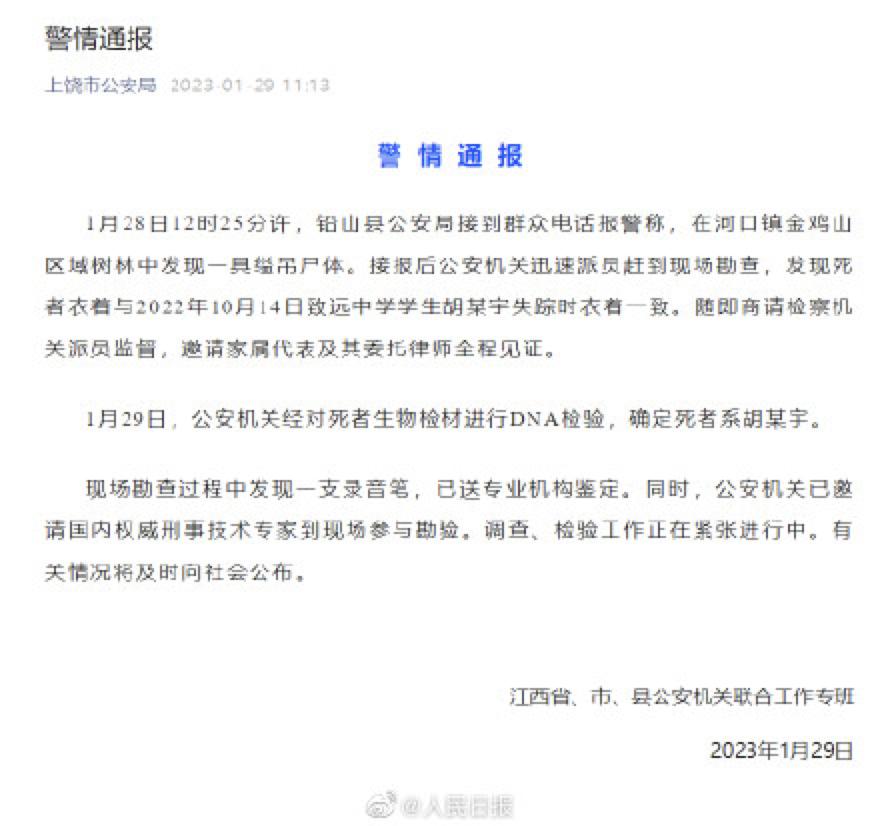 1月28日12时25分许,铅山县公安局接到群众电话报警称,在河口镇金鸡山区域树林中发现一具缢吊尸体。接报后公安机关迅速派员赶到现场勘查,发现死者衣着与2022年10月14日致远中学学生胡某宇失踪时衣着一致。随即商请检察机关派员监督,邀请家属代表及其委托律师全程见证。1月29日,公安机关经对死者生物检材进行DNA检验,确定死者系胡某宇。现场勘查过程中发现一支录音笔,已送专业机构鉴定。同时,公安机关已邀请国内权威刑事技术专家到现场参与勘验。调查、检验工作正在紧张进行中。有关情况将及时向社会公布。(人民日报)
