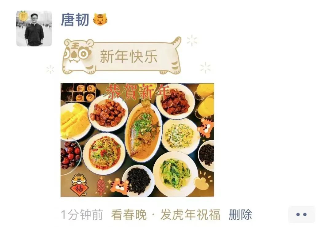 从去年的观察来看,大多数人在除夕夜发布虎年限定款朋友圈的内容都是年夜饭或者家庭合照。一张图片的好处是能直接查看大图,而不用缩略成小方格。