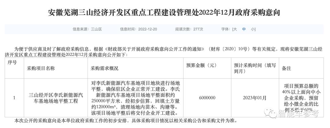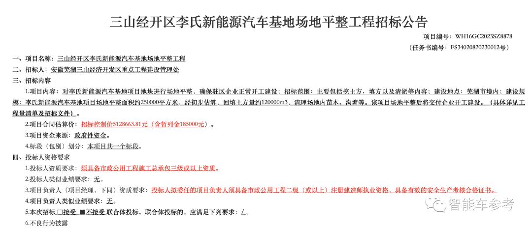 让这种猜测更加真实的是一则官方公告——把“李氏新能源汽车基地”带到了聚光灯下。