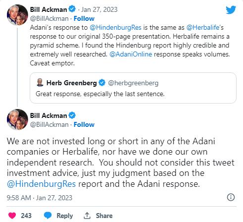 值得一提的是,美国对冲基金大鳄、潘兴广场资本管理公司创始人比尔•阿克曼公开为兴登堡研究站台。阿克曼在其推特上表示,他发现做空机构兴登堡研究关于阿达尼集团的报告“非常可信,且研究非常充分。”