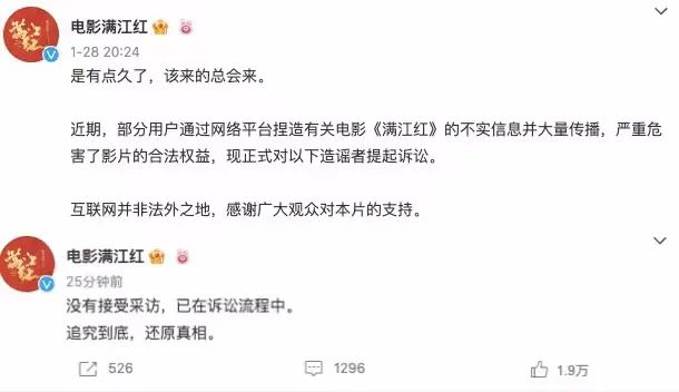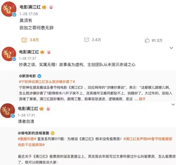 不过一般来说,在舆论发酵初期,官方是不会回应的,可能会在外围做一些投放,试图曲线救国。只有到了片方评估的“非常严重、需要重视”的阶段,才会像《满江红》这样作出严肃回应。不过我看到,《满江红》的宣发人员最近也表态了,不会再起诉其他“造谣者”,也不会就此事进行进一步的官方回应。
