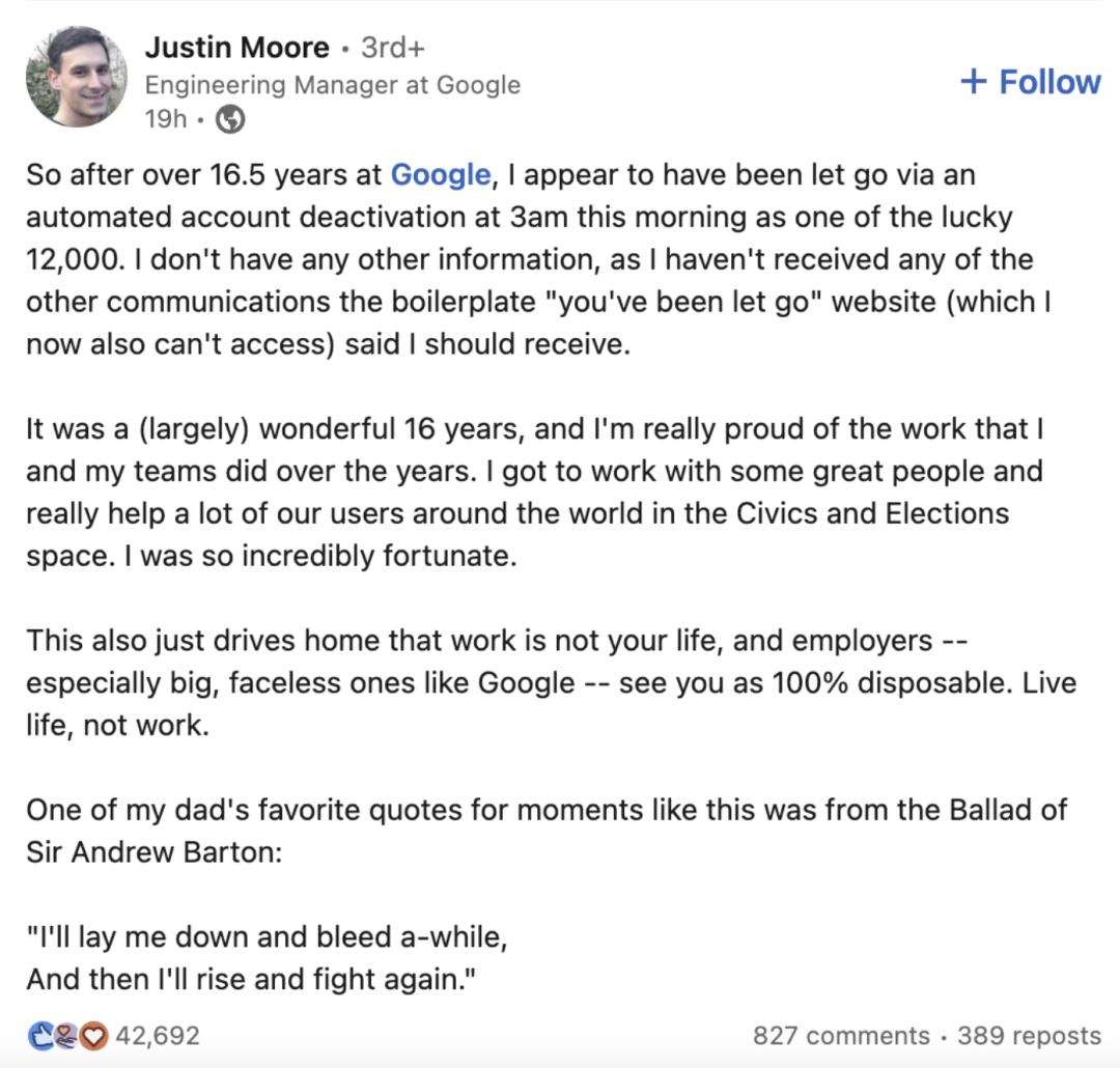 相比前几位较为柔和地对外界告知自己被解聘了,在 Google 工作了 16 年的工程经理 Justin Moore 在 LinkedIn 分享了更多的细节,他称并没有收到任何关于裁员的事前警告或通知。