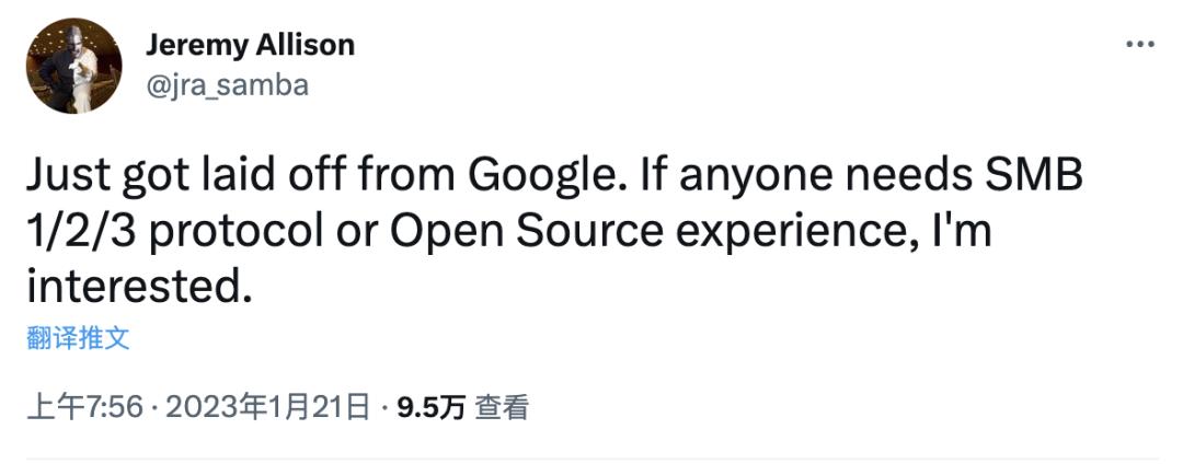 Samba 的联合创始人兼 Google 工程师 Jeremy Allison 也是 Google 开源项目办公室成员之一,他是一位 61 岁的程序员,其以对自由软件社区的贡献而闻名。1 月 21 日,Jeremy Allison 无奈发推表示,「刚从 Google 被解雇。如果有人需要 SMB 1/2/3 协议或者开源经验的,我很感兴趣」。
