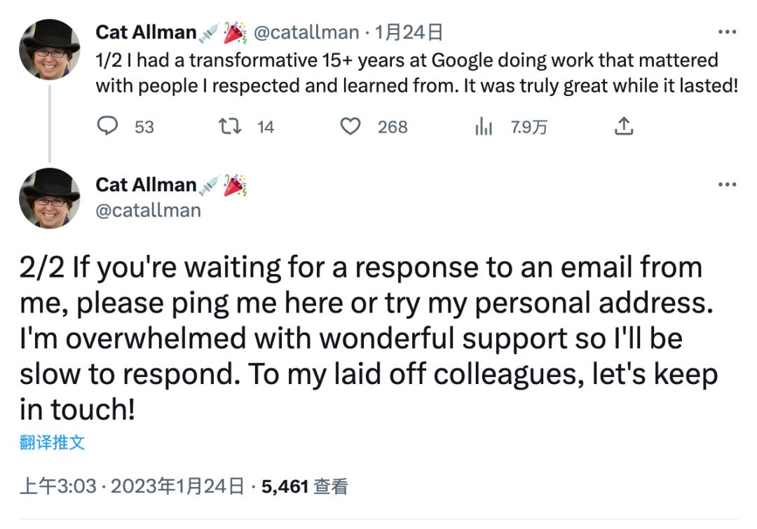 另一位 Cat Allman 在 Google 工作超过了 15 年,她是 Developer EcoSystems 前项目经理。近日,作为被裁员浪潮波及的一员,她说道,「下岗的同事们,以后保持联系吧!」